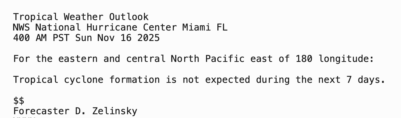 | Tropical Weather Outlook 500 AM PDT Sun 16 Nov 2025 1005 UTC Sun 16 Nov 2025 | |