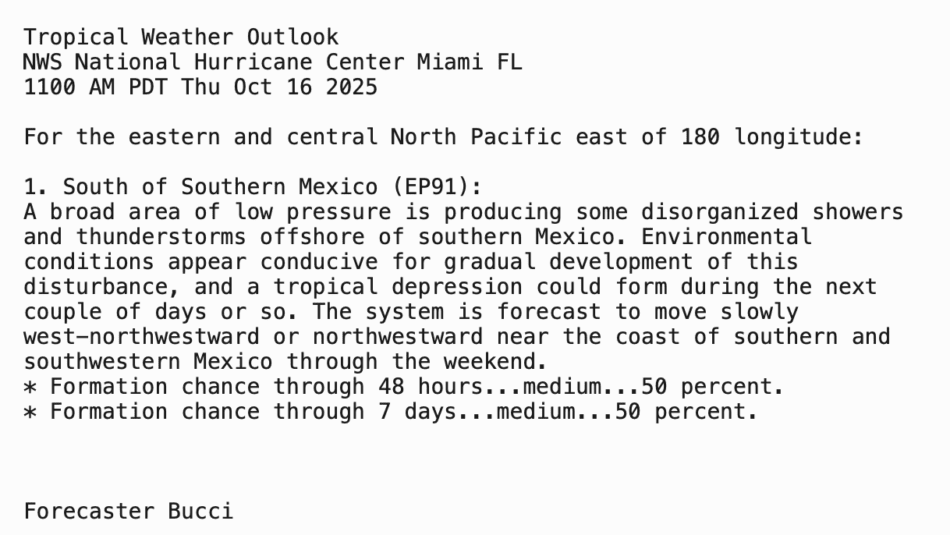 | Tropical Weather Outlook 500 AM PDT Thu 16 Nov 2025 1005 UTC Thu 16 Nov 2025 | |