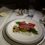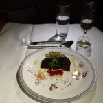 Having done the taste test on a previous flight, I started with a glass of Krug. Interestingly, the flight attendant poured the champagne into glass while holding onto a tray, before settling the glass on my seat. He later told me this was to “minimize discomfort to our passengers.”