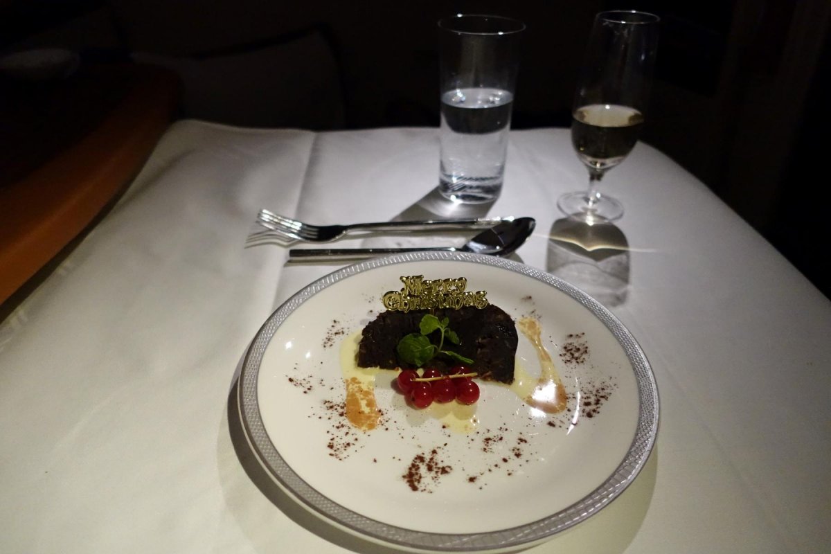 Having done the taste test on a previous flight, I started with a glass of Krug. Interestingly, the flight attendant poured the champagne into glass while holding onto a tray, before settling the glass on my seat. He later told me this was to “minimize discomfort to our passengers.”