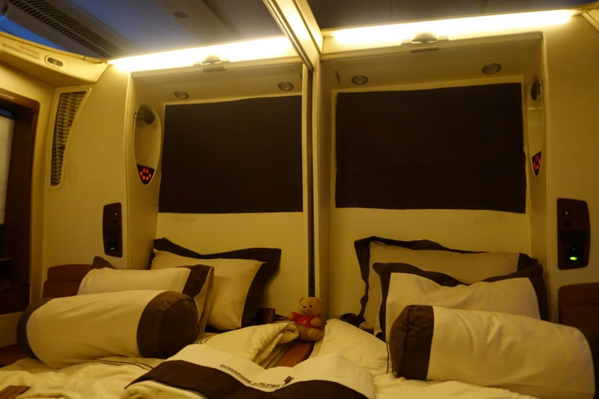 My Christmas wish came true when the purser came back and informed me since the pair of seats in the first row was unoccupied, they’d be happy to make a double bed for me! The bed is unparalleled in comfort and size at 40,000 feet, and even comes with a Singapore Airlines teddy bear.