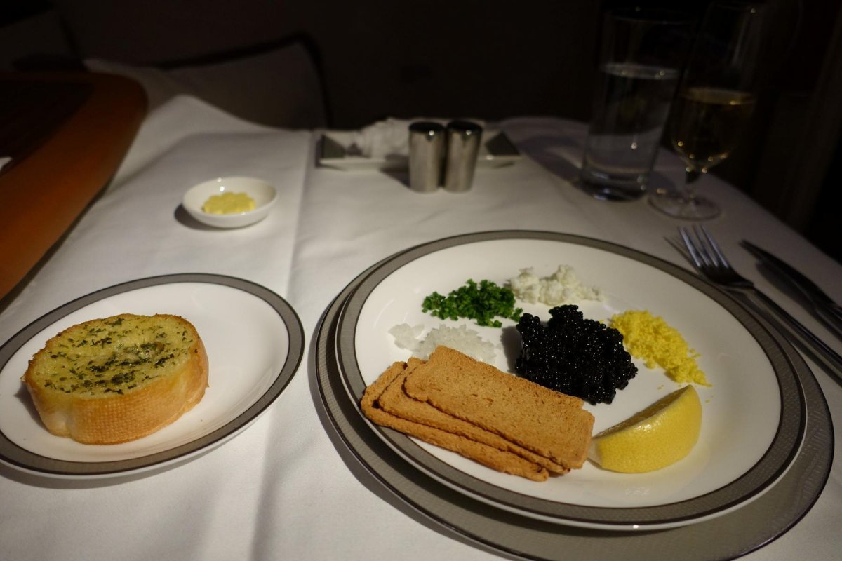 We soon took off as gentle roar of the surprisingly quiet four engines on the A380 came to life. I decided to start with chilled caviar along with garlic toast.