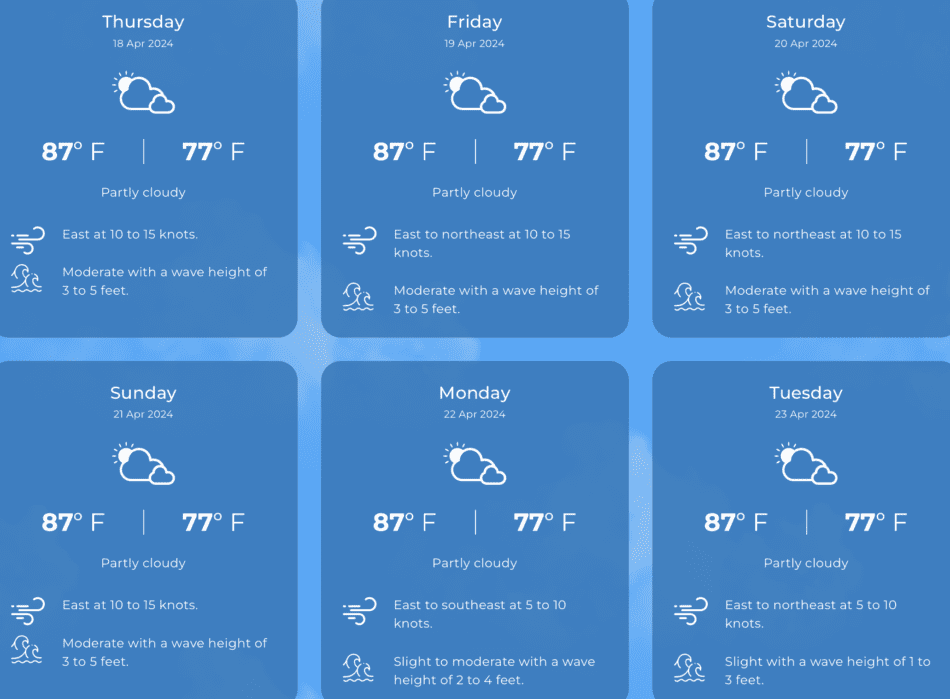 Expected temperatures: 77°F to 87°F. Yesterday: H 87.4°F  L 77.4.°F