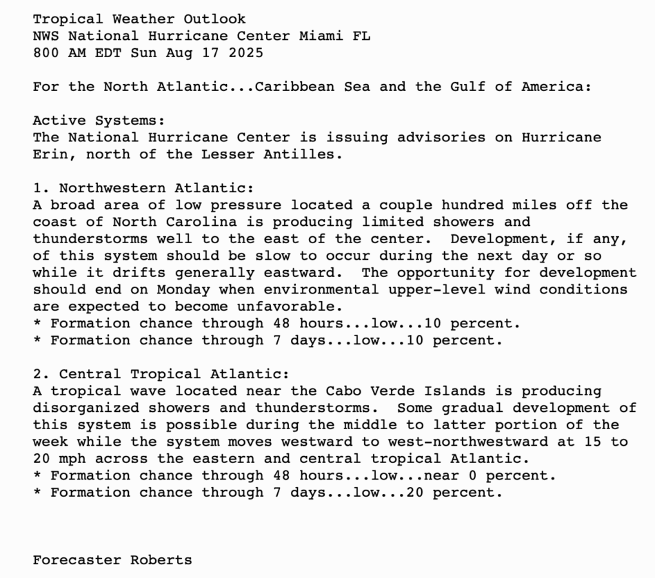 | Tropical Weather Outlook 800 AM EDT Sun 17 Aug 2025 1205 UTC Sun 17 Aug 2025 | |