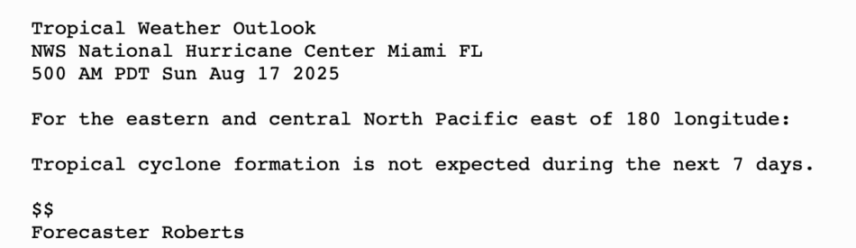 | Tropical Weather Outlook 500 AM PDT Sun 17 Aug 2025 1005 UTC Sun 17 Aug 2025 | |