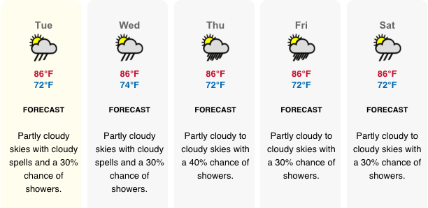 Temperature: Today’s expected temperatures – 77°F to 88°F. Yesterday: H 88.1°F L 77.0°F