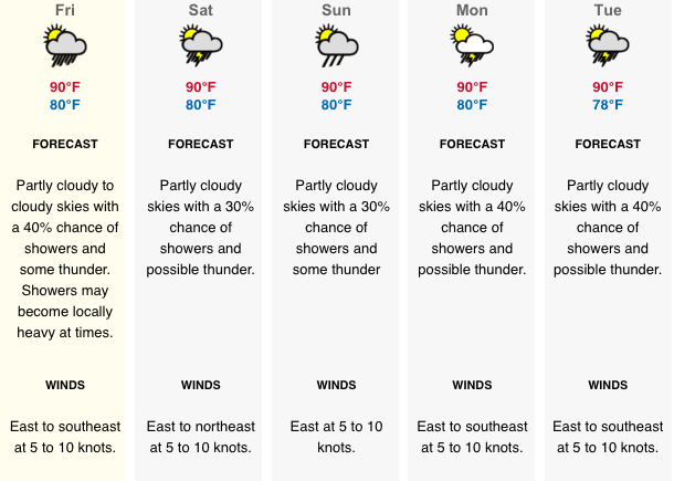 Temperature: Today’s expected temperatures – 79° to 92°F. Yesterday: H 91.2°F L 77.0°F