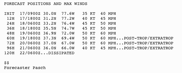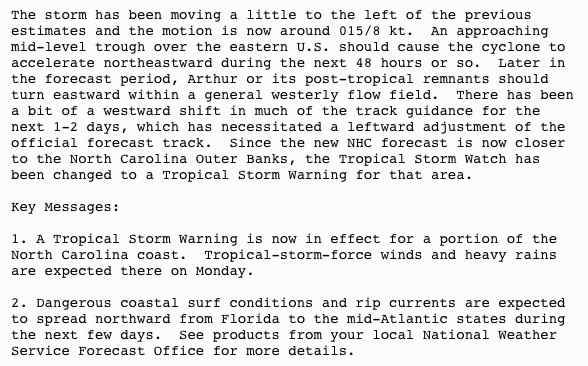 TS ARTHUR MOVING NORTH-NORTHEASTWARD
