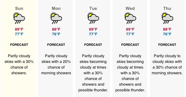 Temperature: Today’s expected temperatures – 82°F to 90°F. Yesterday: H 88.5°F L 81.3°F