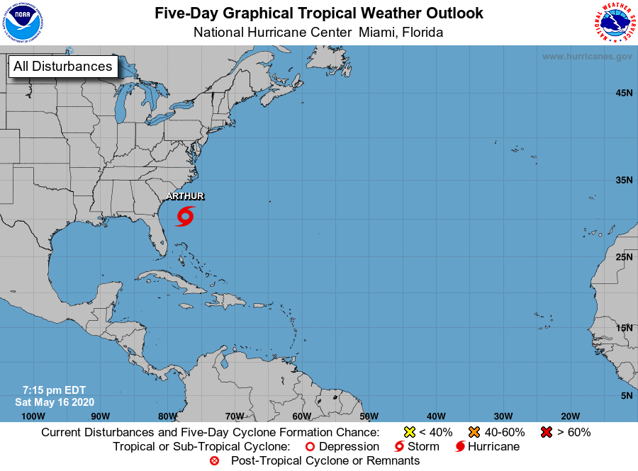 Light to moderate southeasterly winds and seas are expected across the Cayman area for the next 24 hours as Tropical storm Arthur moves the Western Atlantic Ocean. Radar images show isolated showers in and around the Cayman area moving towards the north. The National Hurricane Center in Miami Florida is issuing advisories on Tropical storm Arthur: At 4 a.m. One was located near 30.0 north and 77.6 west or about 380 miles south southwest of Cape Hatteras North Carolina with maximum sustained winds of 40 mph and moving towards the north northeast at 9 mph. THIS SYSTEM POSES NO THREAT TO THE CAYMAN ISLANDS. For further information on this system, please check the National Hurricane Center website at http://www.nhc.noaa.gov
