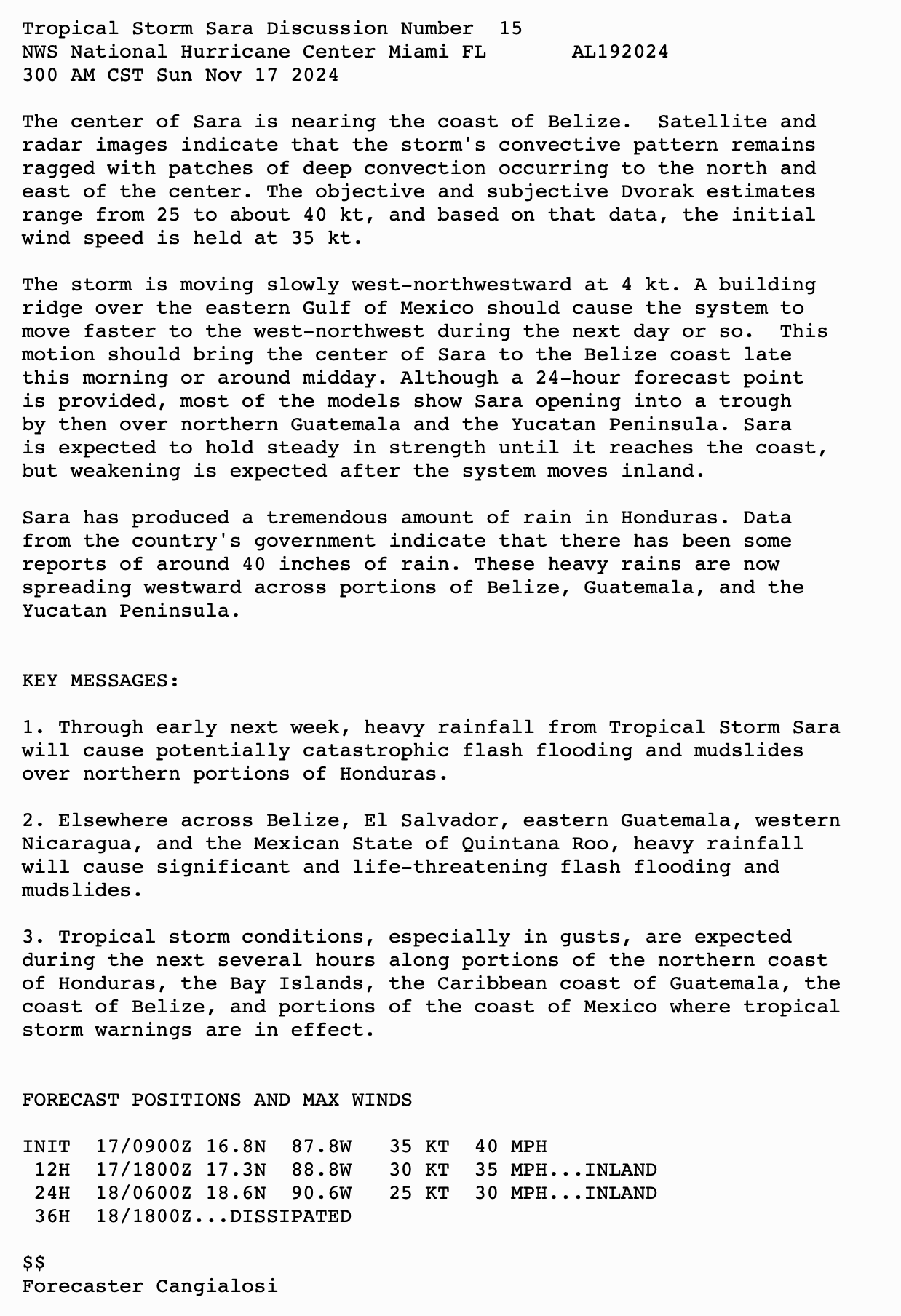 SARA NEARING LANDFALL ALONG THE BELIZE COAST WITH HEAVY RAINS MOVING INLAND OVER PORTIONS OF THE YUCATAN PENINSULA