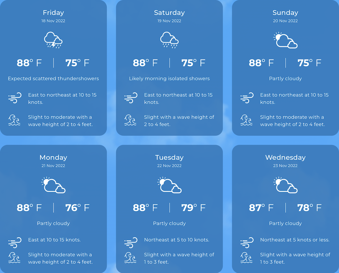 IMPORTANT NOTICEThe times reflected in the tidal table for Grand Cayman are predictions valid as references for sports fishing in areas near the coast of Grand Cayman. THEY ARE NOT SUITABLE FOR NAVIGATION. Remember that to practice any activity at sea like diving, windsurfing and fishing from a boat or underwater fishing should always be consulted with the official tide tables of the port of Grand Cayman.