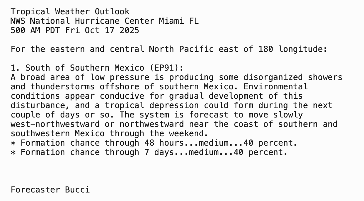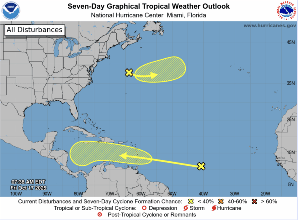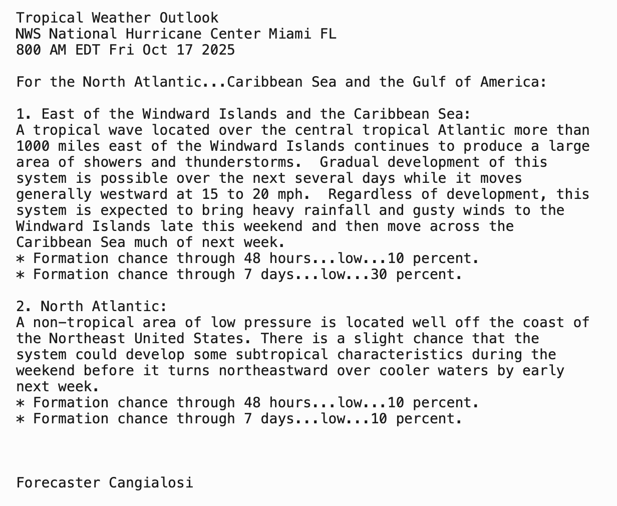 | Tropical Weather Outlook 800 AM EDT Fri 17 Oct 2025 1205 UTC Fri 17 Oct 2025 | |