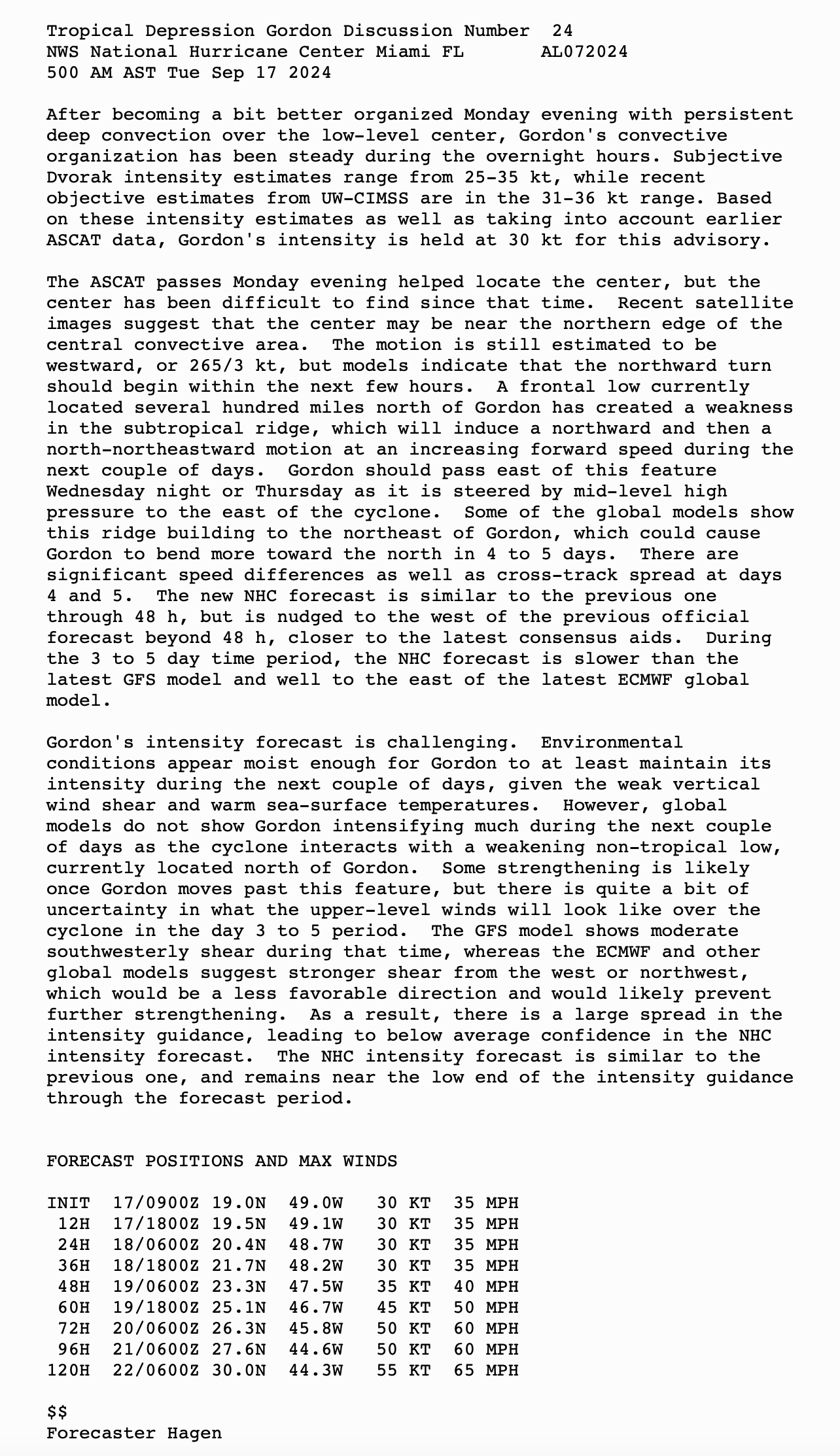 GORDON EXPECTED TO TURN NORTHWARD TODAY