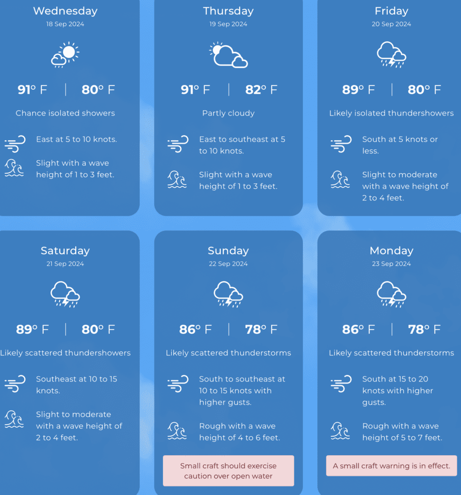 Today: Partly cloudy with afternoon showers or thunderstorms. Winds E at 10 to 15 mp.
