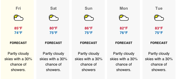 Temperature: Today’s expected temperatures – 77°F to 87°F. Yesterday: H 87.3.°F L 73.5°F