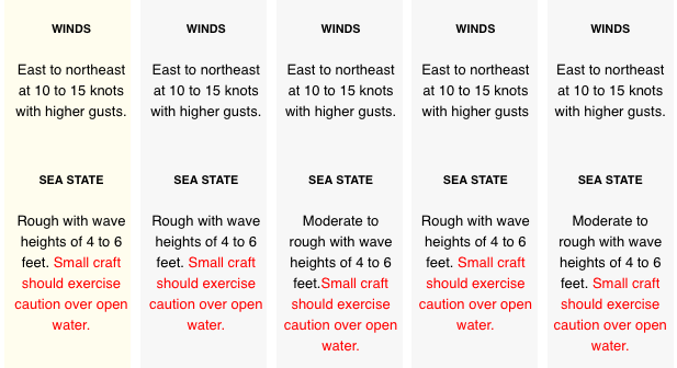 Moderate to high winds and rough seas. Small craft warning in effect. A mix of cloud and sun today. Clear to partly cloudy tonight.