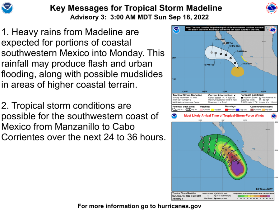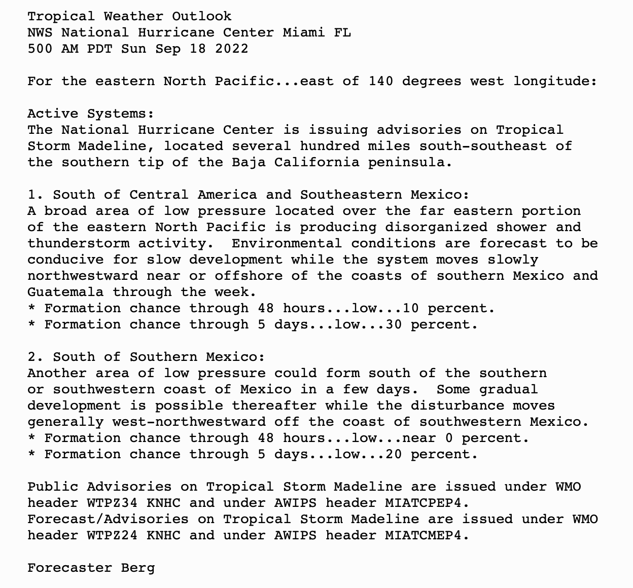 | Tropical Weather Outlook 500 AM PDT Sun Sep 18 2022 Tropical Weather Discussion 1005 UTC Sun Sep 18 2022 | |