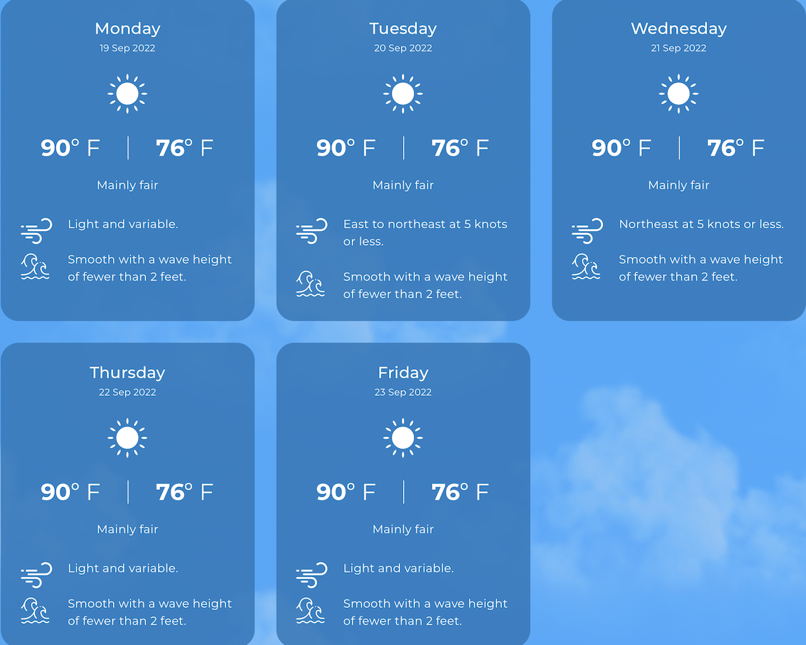 IMPORTANT NOTICEThe times reflected in the tidal table for Grand Cayman are predictions valid as references for sports fishing in areas near the coast of Grand Cayman. THEY ARE NOT SUITABLE FOR NAVIGATION. Remember that to practice any activity at sea like diving, windsurfing and fishing from a boat or underwater fishing should always be consulted with the official tide tables of the port of Grand Cayman.