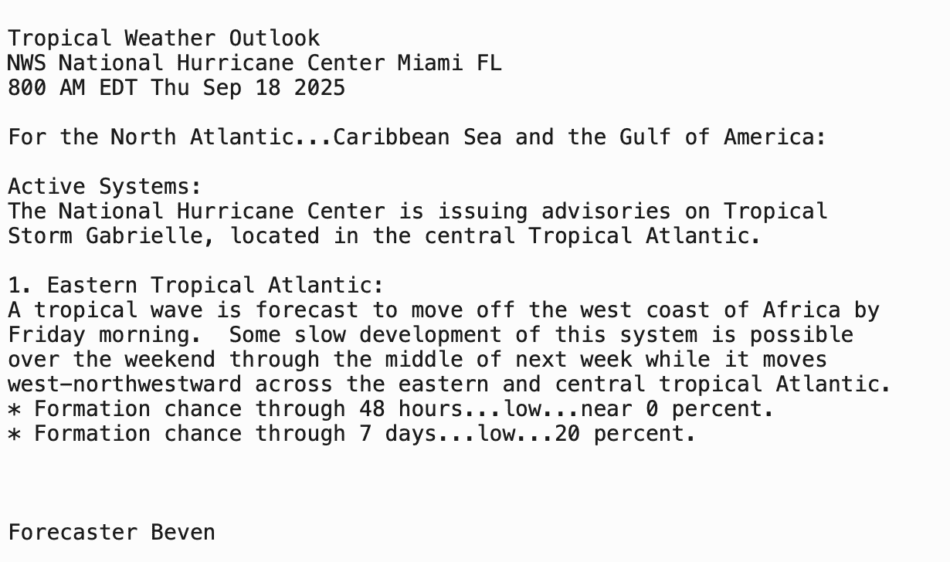 | Tropical Weather Outlook 800 AM EDT Thu 18 Sep 2025 1205 UTC Thu 18 Sep 2025 | |