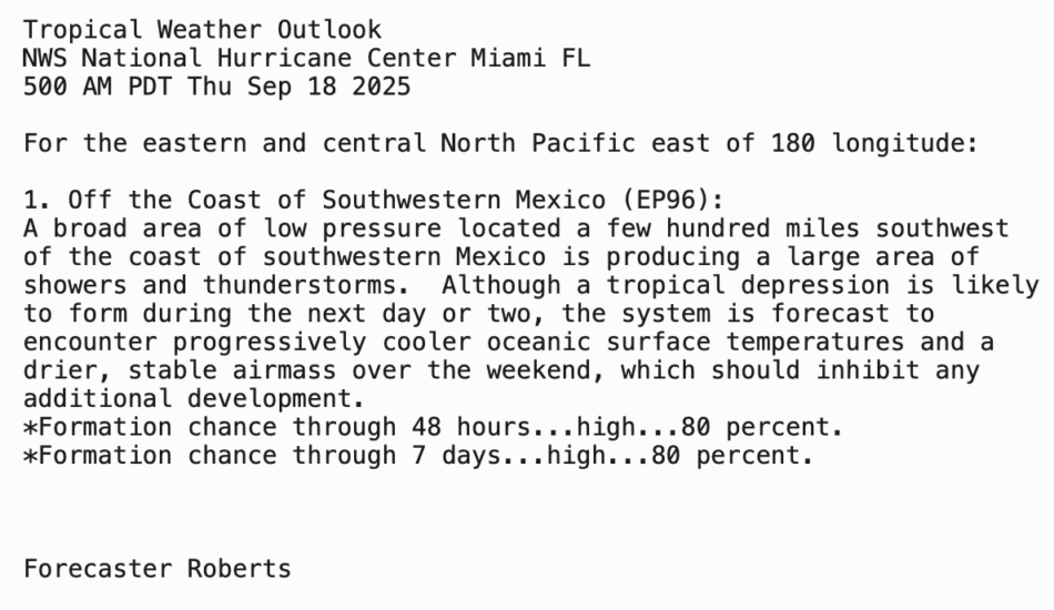 | Tropical Weather Outlook 500 AM PDT Thu 18 Sep 2025 1005 UTC Thu 18 Sep 2025 | |