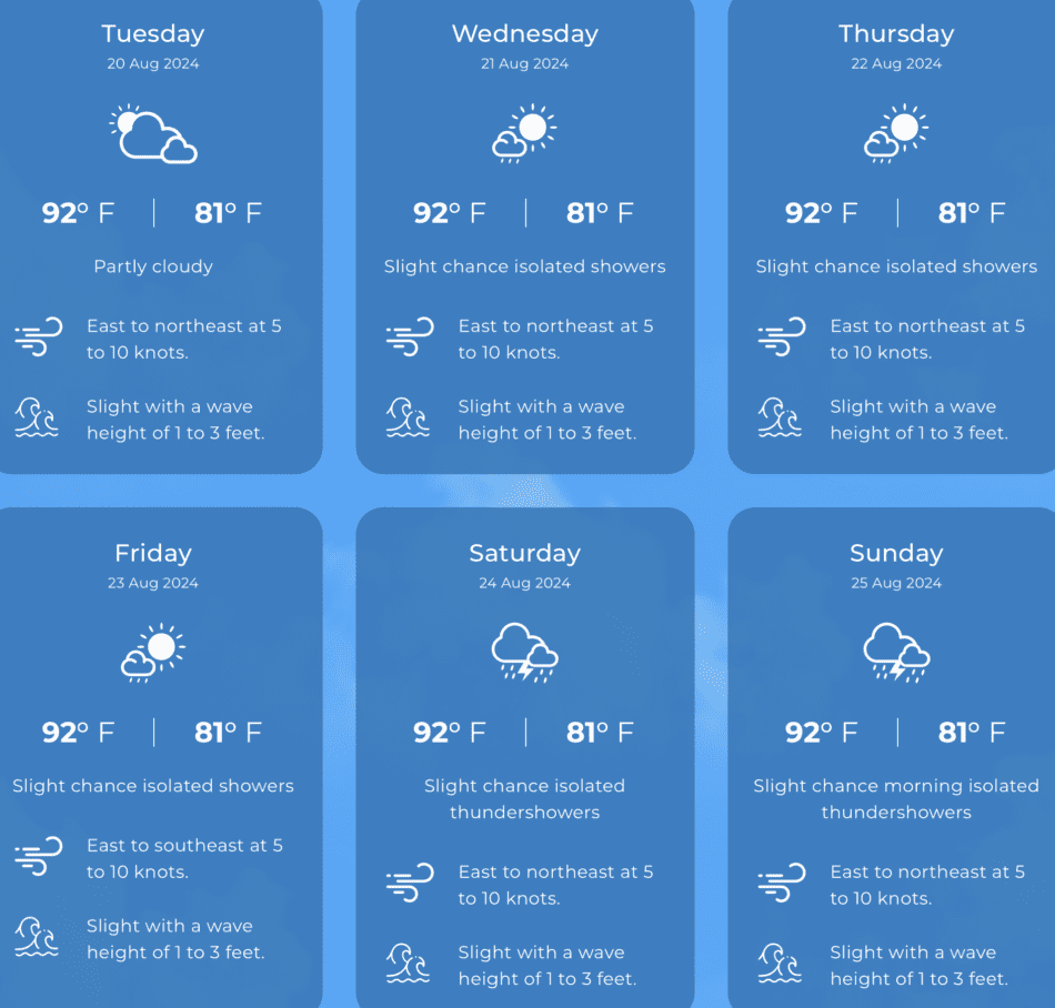 A weak pressure gradient across the northwest Caribbean will support light winds and slights sea across the Cayman area during the next few days. A tropical wave, passing to the south of the Cayman area may contribute to isolated showers and possible thunder across the island today. The National Hurricane Center continues to issue advisories on hurricane Ernesto. Further information can be found at www.nhc.noaa.gov. This storm poses no immediate threat to the Cayman Islands.
