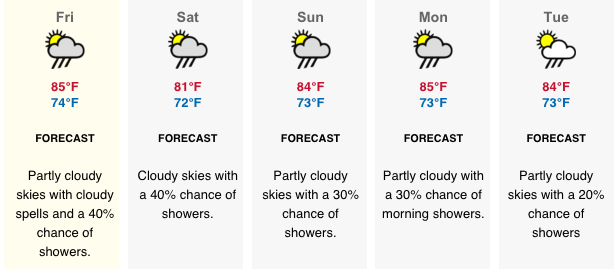 Temperature: Today’s expected temperatures – 78°F to 87°F. Yesterday: H 87.0°F L 77.9°F