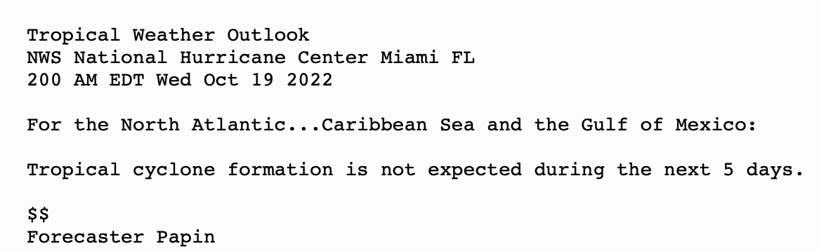 | Tropical Weather Outlook (en Español*) 800 AM EDT Wed Oct 19 2022 1205 UTC Wed Oct 19 2022 | |