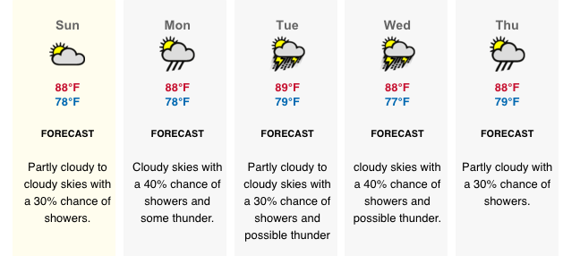 Temperature: Today’s expected temperatures – 83° to 92°F. Yesterday: H 90.8°F L 79.6°F