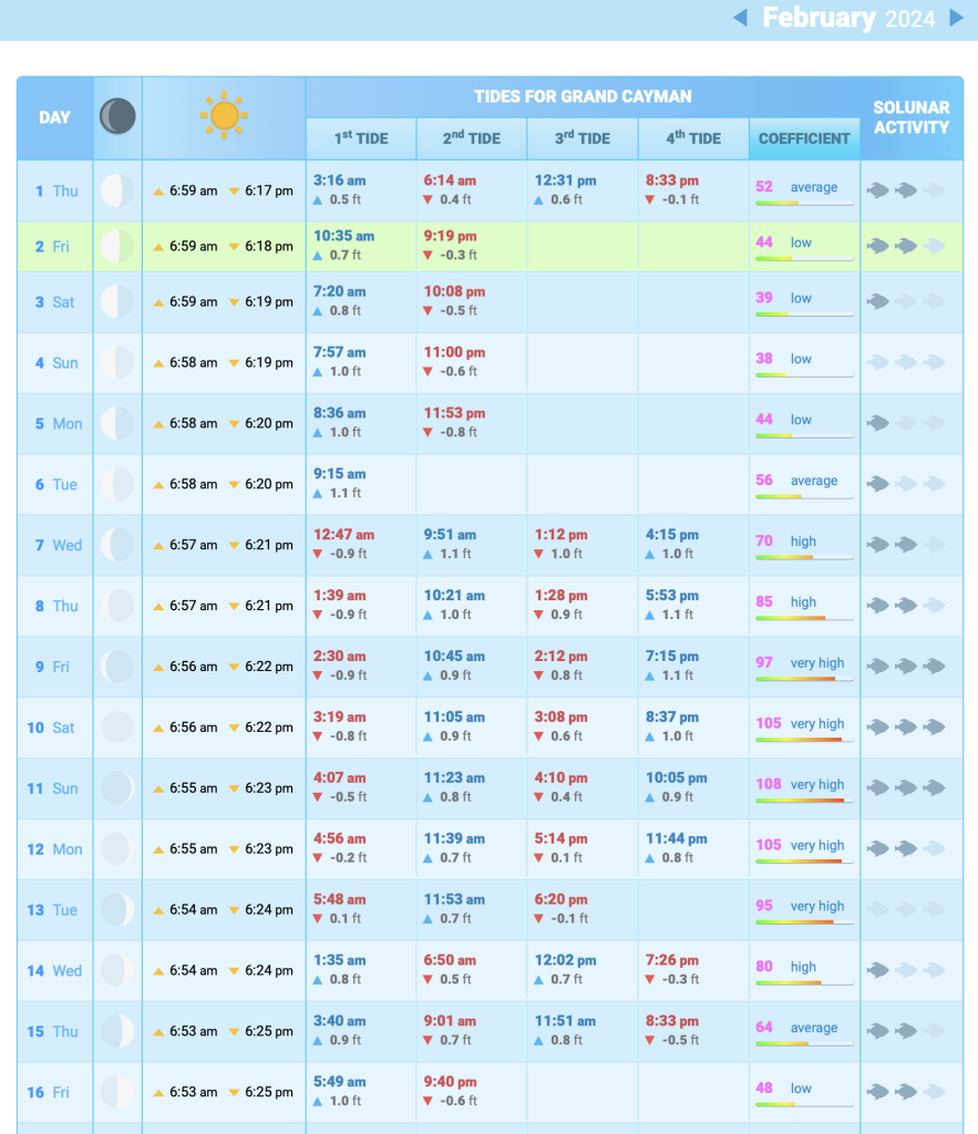Grand Cayman Sun & Tides Tables February 2024