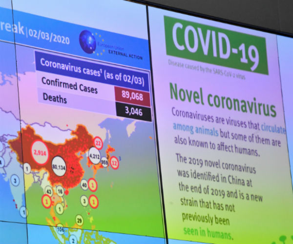 This March 2, 2020 photo shows a screen with graphic updates on the progress of the coronavirus COVID-19 outbreak around the world, during a press conference held at the Emergency Response Coordination Centre in Brussels. (John Thys AFP via Getty Images)