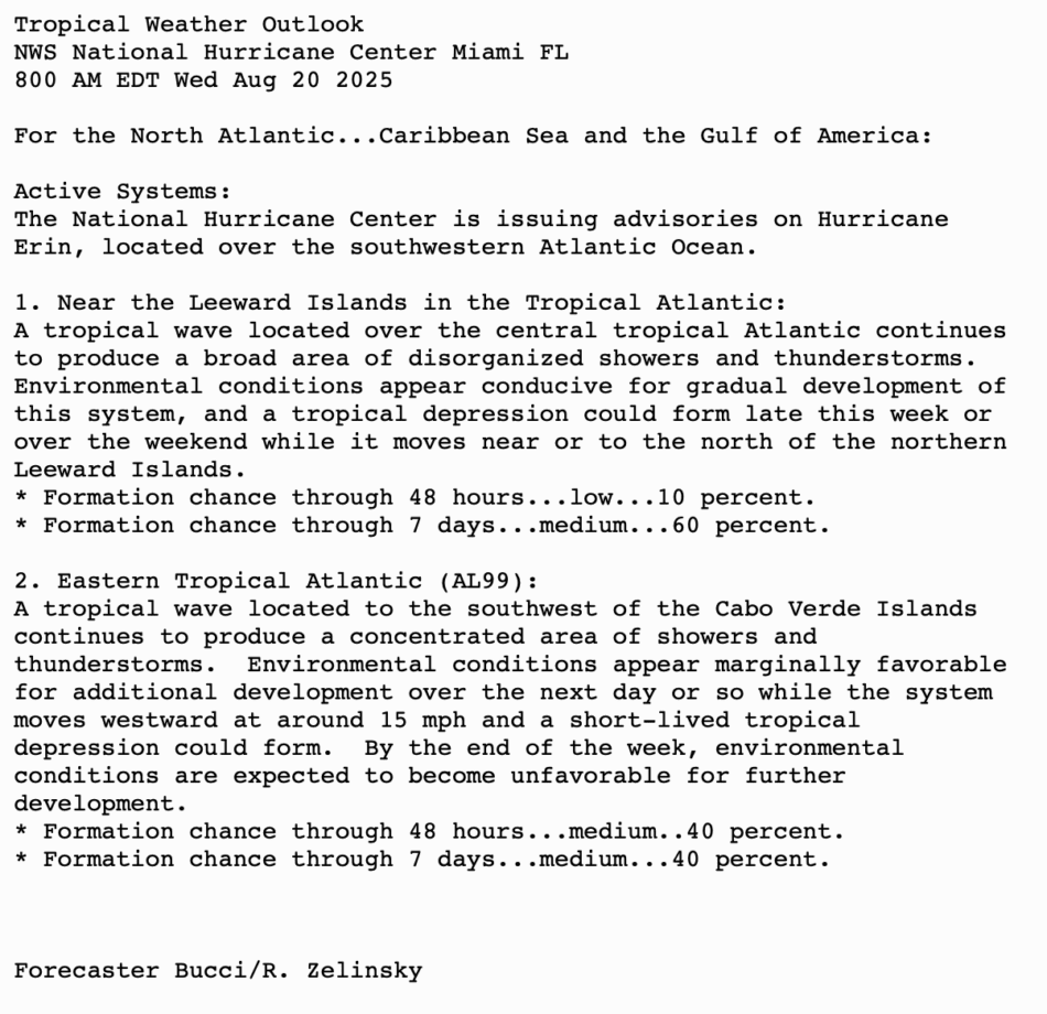 | Tropical Weather Outlook 800 AM EDT Wed 20 Aug 2025 1205 UTC Wed 20 Aug 2025 | |