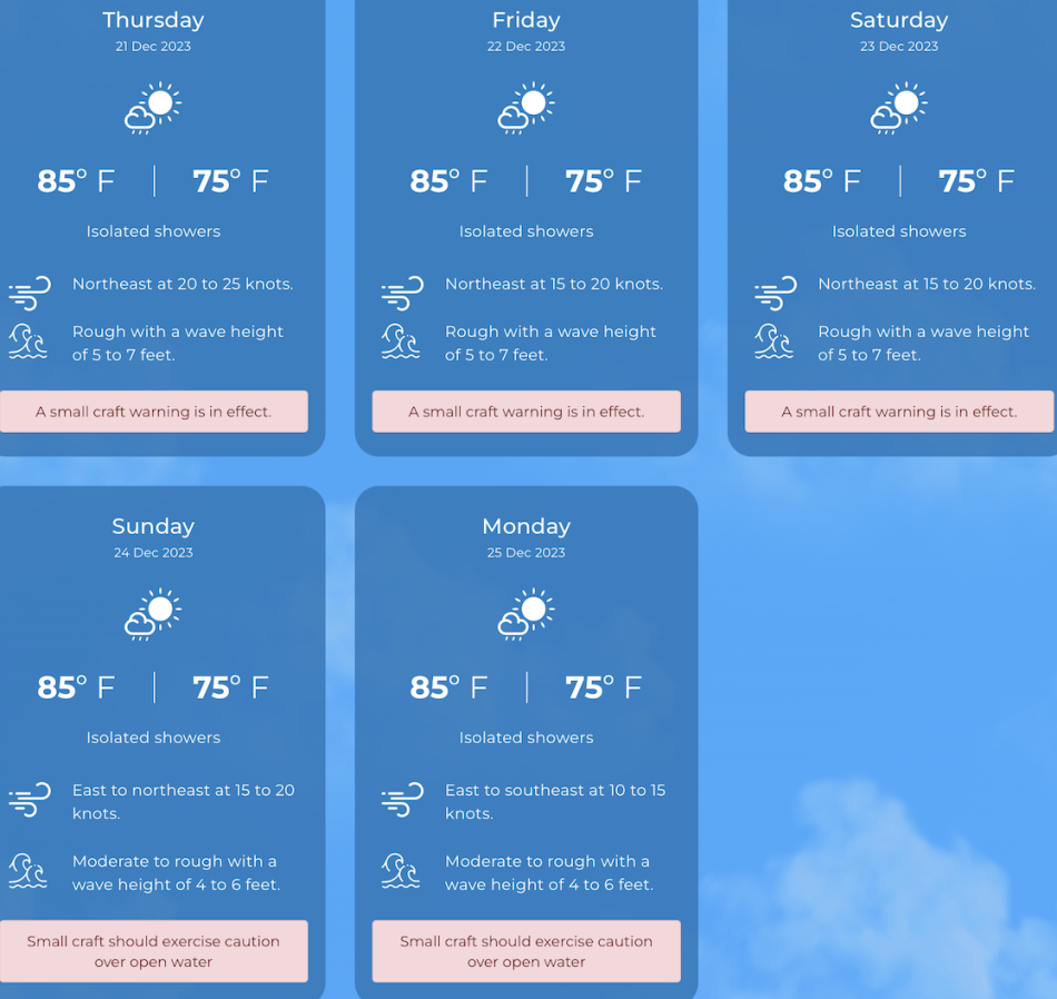 Sea: Rough with a wave height of 5 to 7 feet. A small craft warning is in effect.