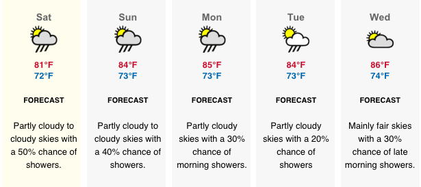 Temperature: Today’s expected temperatures – 75°F to 87°F. Yesterday: H 87.6°F L 75.3°F