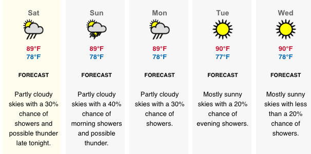 Temperature: Today’s expected temperatures – 79° to 91°F. Yesterday: H 90.5°F L 77,0°F