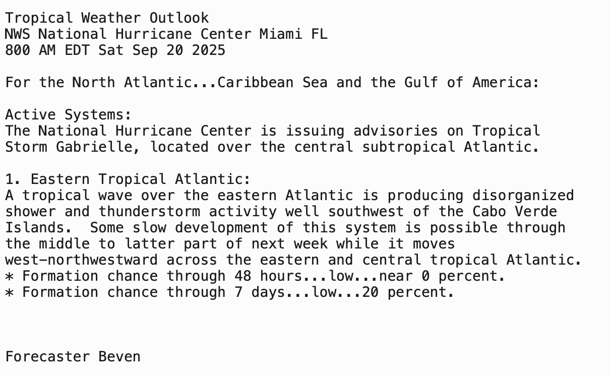 | Tropical Weather Outlook 800 AM EDT Sat 20 Sep 2025 1205 UTC Sat 20 Sep 2025 | |