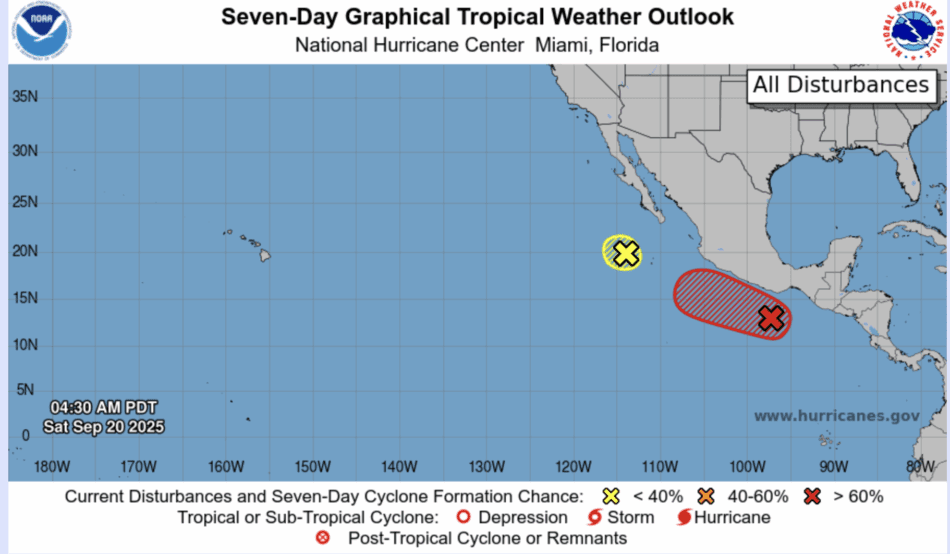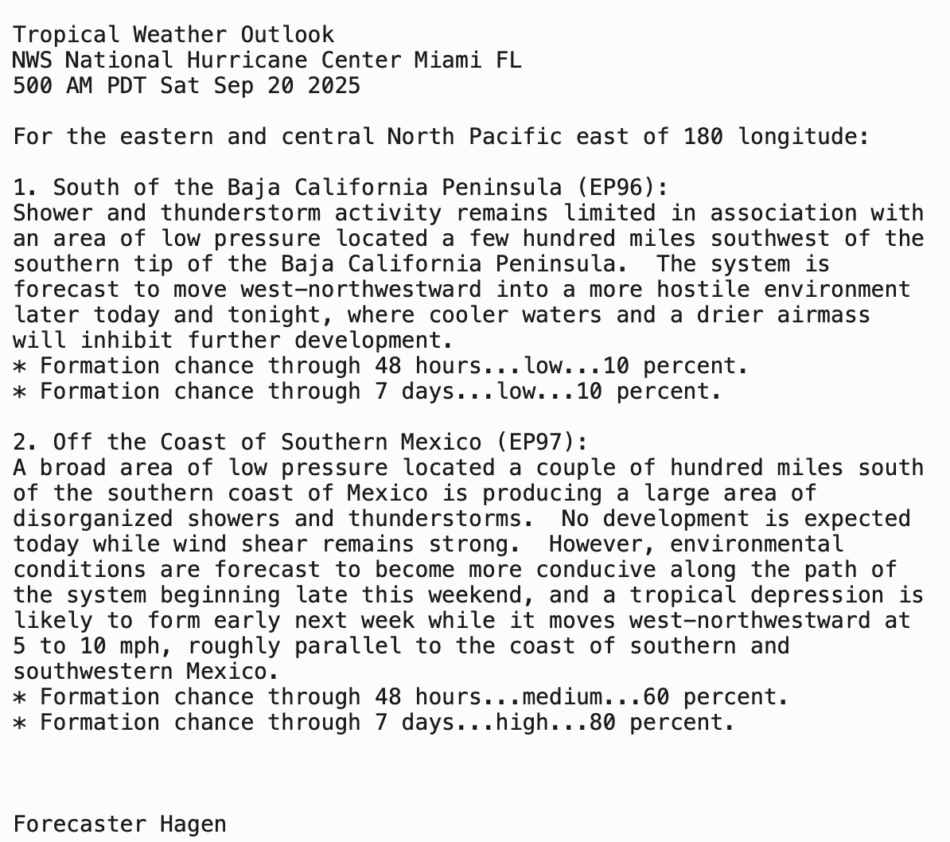 | Tropical Weather Outlook 500 AM PDT Sat 20 Sep 2025 1005 UTC Sat 20 Sep 2025 | |