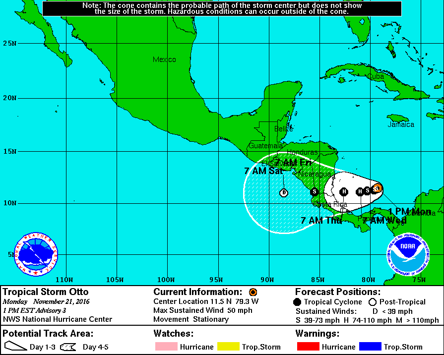 From Caribbean News Service MIAMI, Florida, Nov 21 2016 — A late-season tropical storm has formed in the southwestern Caribbean . The Tropical Storm named Ottos has maximum sustained winds at 50 mph. [See below for latest from NHC] The…