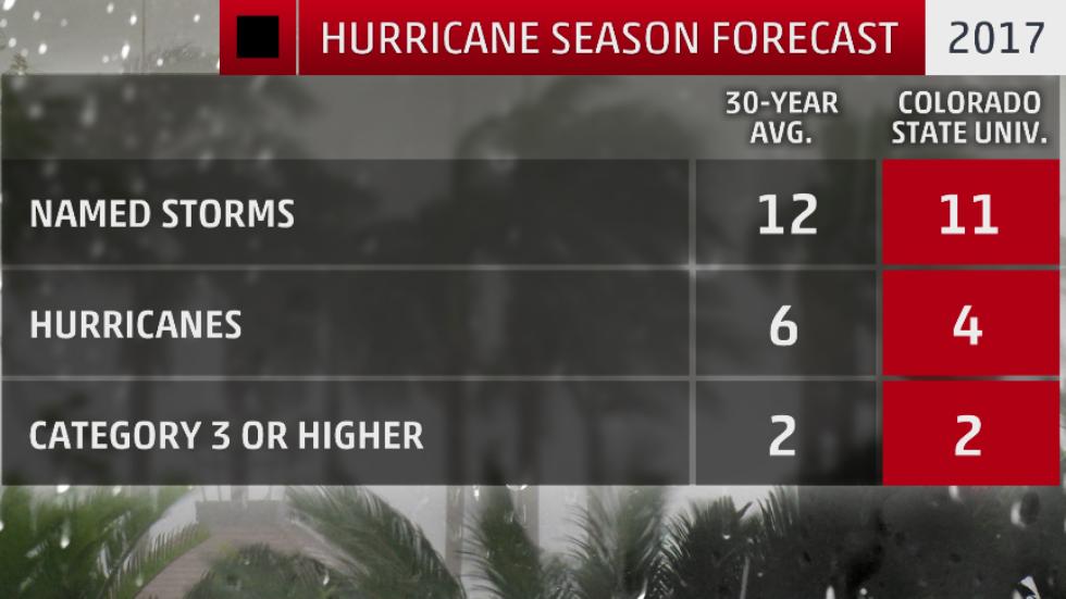 The 2017 Atlantic hurricane season forecast released Thursday from Colorado State University calls for the number of named storms and hurricanes to be slightly below historical averages.