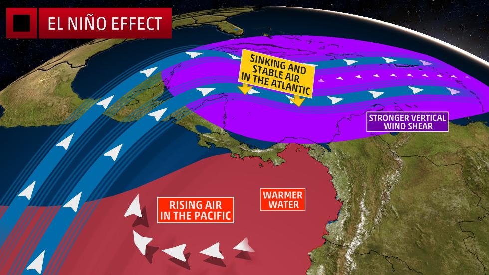 This periodic warming of the central and eastern equatorial waters of the Pacific Ocean tends to produce areas of stronger wind shear (the change in wind speed with height) and sinking air in parts of the Atlantic Basin that is hostile to either the development or maintenance of tropical cyclones.