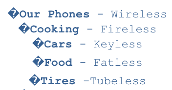 This is priceless!!! From a reader �Our Phones – Wireless �Cooking – Fireless �Cars – Keyless �Food – Fatless �Tires -Tubeless �Dress – Sleeveless �Youth – Jobless �Leaders – Shameless �Relationships – Meaningless �Attitudes – Careless �Babies – Fatherless �Feelings…