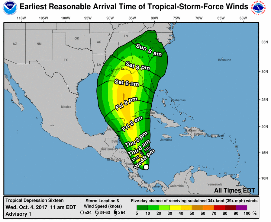 From NHC Tropical Depression Sixteen Discussion Number 1 NWS National Hurricane Center Miami FL AL162017 1100 AM EDT Wed Oct 04 2017 Satellite images indicate that the area of low pressure in the southwestern Caribbean Sea has become better organized…