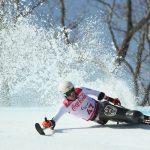 Hiraku Misawa of Japan sent the snow flying while competing in the men’s standing downhill ski event.