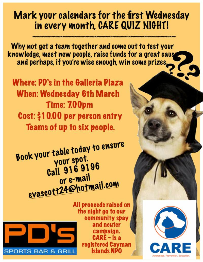 10th Annual Cayman Islands Care Dog Jog Sunday March 3rd 2019 7am Dragons Bay, Safehaven $25 to register. CARE Quiz Night is on Wednesday, 6th March Come join in the fun and test the gray matter! Not able to make…