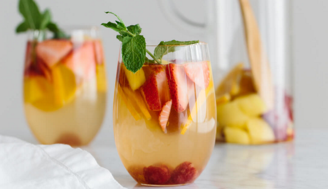 White Sangria with Mango and Berries By Lisa brown DOWNSHIFTOLOGY From Yummly 7 Ingredients 10 Minutes 280 Calories Ingredients 1 mango (peeled and diced) 1/2 Orange (thinly sliced) 6 strawberries (sliced) 1/2 cup raspberries 1/3 cup cointreau (Grand Marnier or other orange-flavored liquor) 1 bottle white wine fresh mint leaves (for garnish) Nutrition 280…