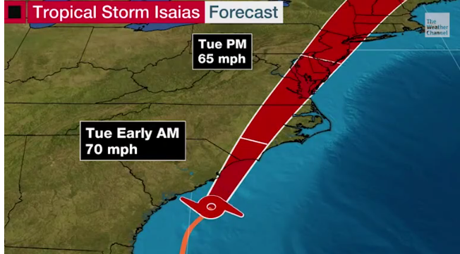 From Weather.com At a Glance Isaias will track into the Carolinas late Monday into early Tuesday. A hurricane warning is now in effect for parts of South Carolina and North Carolina. Storm surge flooding, strong wind gusts and heavy rain…