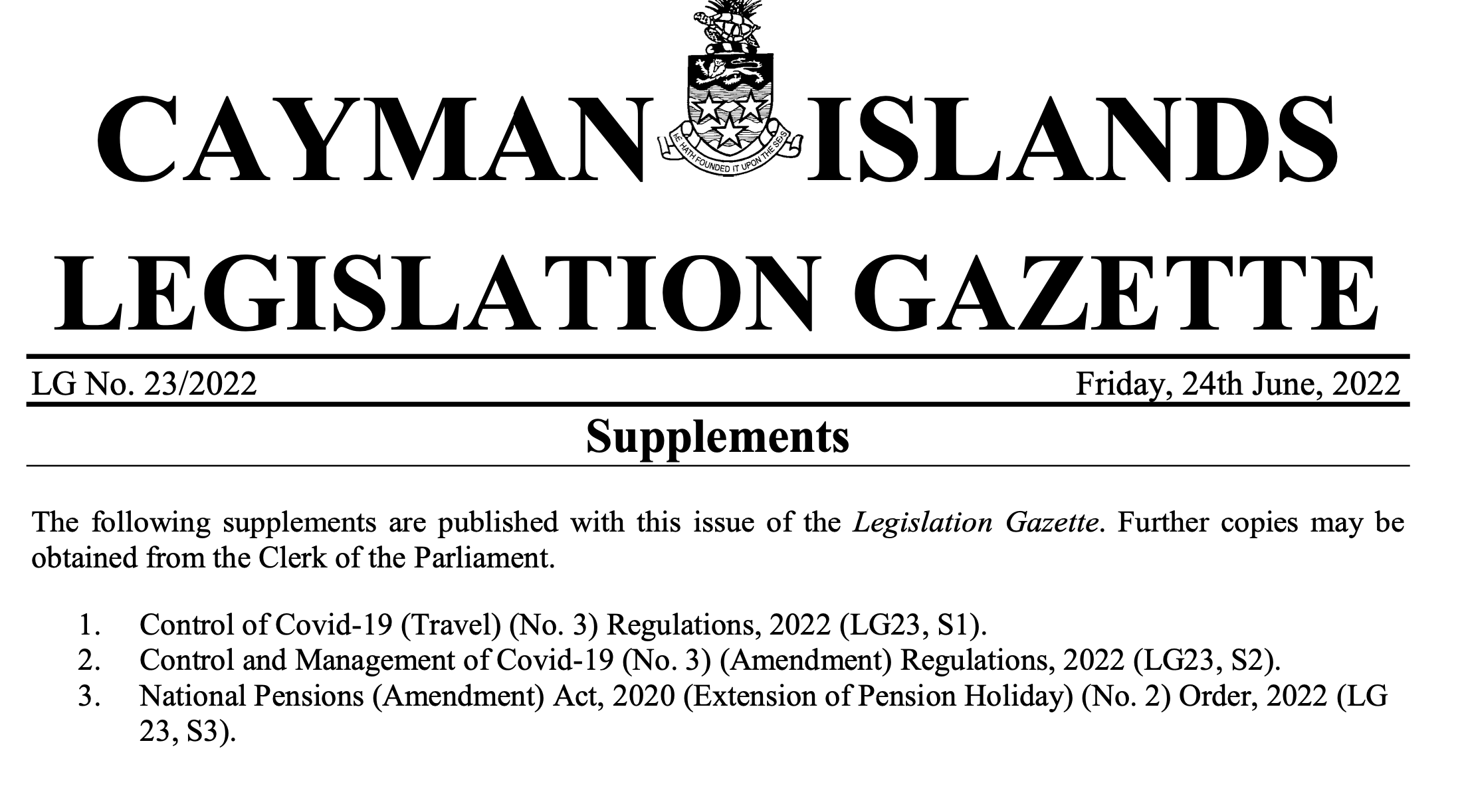 LG23 Legislation Gazette No. 23/2022 S1 Control of Covid-19 (Travel) (No. 3) Regulations, 2022 (LG23, S1) S2 Control and Management of Covid-19 (No. 3) (Amendment) Regulations, 2022 (LG23, S2) S3 National Pensions (Amendment) Act, 2020 (Extension of Pension Holiday) (No. 2) Order, 2022…