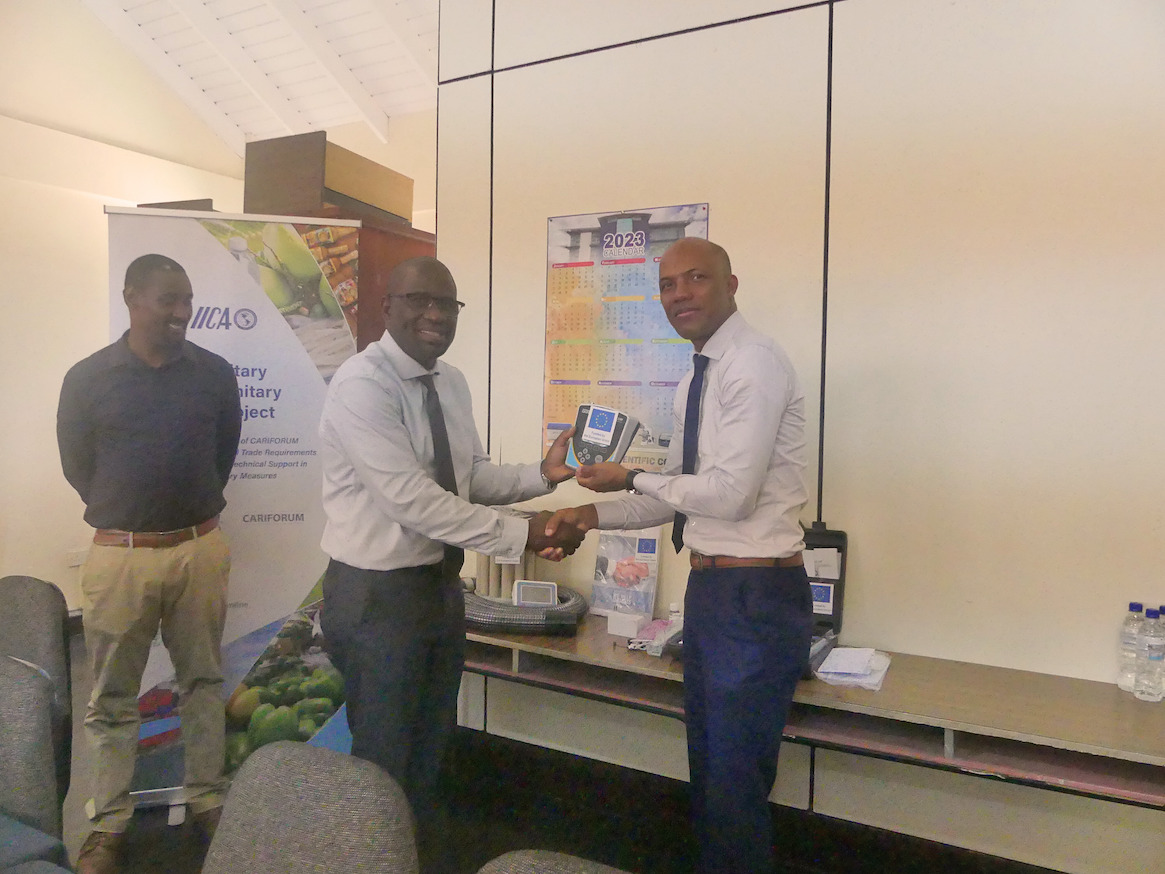 Handing-over of Laboratory Equipment, from left: Erwin Henry, Chief Analytical Chemist, Grenada Produce Chemist Laboratory; Aaron Francois, Permanent Secretary, Ministry of Agriculture and Lands, Fisheries & Cooperatives, Government of Grenada and Gregory Delsol, Technical Specialist, IICA Grenada Delegation. Bridgetown, Barbados,…