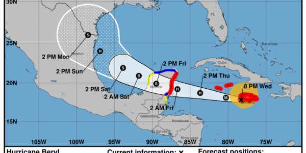 As of 7:00 p.m., Hurricane Beryl was located 215 miles East Southeast of Grand Cayman. The hurricane is exhibiting maximum sustained winds of 130 mph and is moving West Northwest at a speed of 20 mph. A hurricane warning remains in…