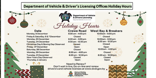 Grand Cayman, 27 November, 2024. The Department of Vehicle and Drivers’ Licensing (DVDL) wishes to advise the public of its hours of operation during the holiday season. The adjusted hours are: The offices will resume normal hours of operation starting…